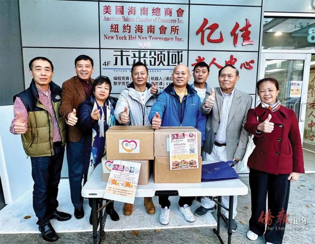 【侨报记者崔国萁2024年11月26日纽约报道】为了让布碌仑八大道华社的耆老们开心欢度感恩节,市议员庄文怡、州众议员寇顿携手纽约海南会所,于26日举行了“感恩节免费派送食物”活动,有80多位耆老获赠了装满各种食物的食物箱。该活动于26日下午在位于布碌仑八大道60街876号的纽约海南会所门前举行,得知消息的华裔耆老们早早赶来排队。纽约海南会所会长陈在福、纽约海南同乡会会长吴诗钊、美国海南总商会会长谢自力及执行会长谢晓松,与寇顿幕僚长贺立宁一起率领十多位义工在现场为大家发放食物,将一箱箱食物送到老人们的手上,而每个箱子装满了饮料、米、意大利面、牛奶、葡萄干以及各种罐头等。陈在福会长感谢庄文怡和寇顿两位议员过节时不忘社区民众,向老人家们发放食物,让大家感受到节日的温暖,而华人们将继续支持两位议员为社区做贡献。谢自力则表示,自纽约海南会所和美国海南总商会乔迁至八大道新会所后,一直致力于让会所成为服务社区和支持华人参政议政的永久地点,当天他们发动了义工们为民众服务,也期待着继续更好地服务社区。寇顿幕僚长贺立宁表示,八大道和日落公园社区华人众多,一直有很强的需求,但资源长久以来没有配合到位。当天寇顿和庄文怡两位议员联合起来,并借助一直扎根社区的纽约海南会所的地点,在感恩节来临之际向社区派送食物,希望通过活动能聊表对社区耆老的谢意,并祝老人家和所有人感恩节快乐。